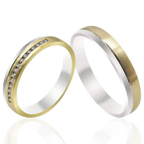 Discover our stunning collection of wedding rings, designed to celebrate your unique bond. These elegant wedding bands are presented as a matching pair, one featuring a delicate channel setting of sparkling stones, and the other a clean, minimalist band with a distinctive central groove. Available in versatile two-tone designs, choose from sophisticated silver and rose gold, classic silver and yellow gold, or a full silver-tone finish. The left ring in each pair is beautifully adorned with a row of meticulously set zirconia stones, while the right ring offers a sleek, unadorned surface with a subtle beveled edge, perfect for mens wedding bands or wedding rings for women.